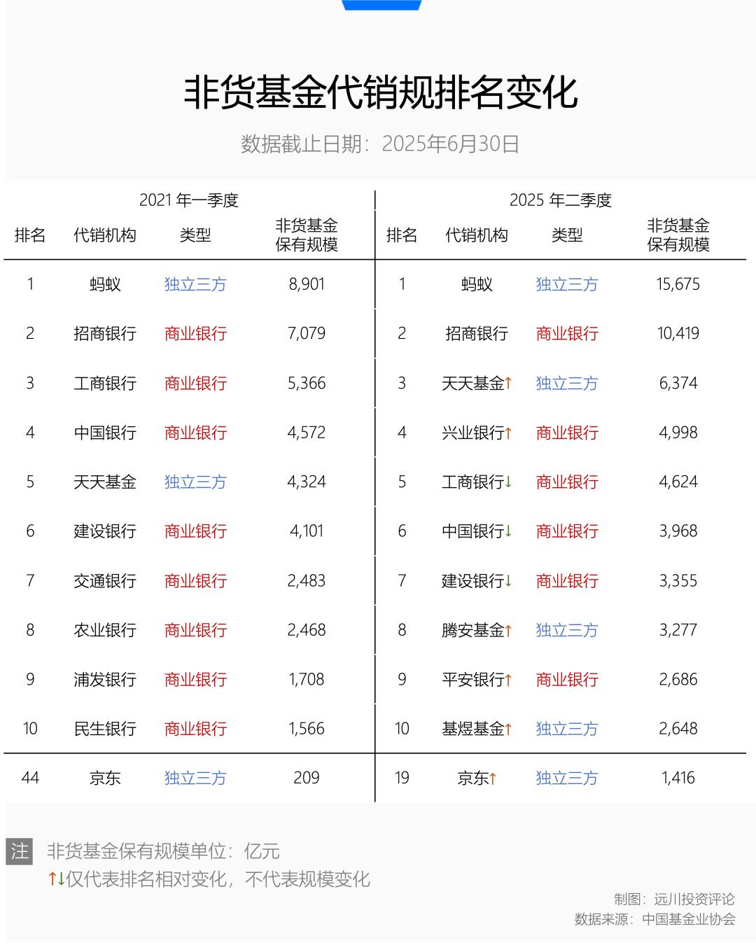 不过,一系列争夺市场份额的组合拳打下来,效果还是有的。截至 2025 年上半年,京东的非货基金保有规模已经达到 1419 亿,排全行业第 19 名,在独立三方里则排到了第 5。