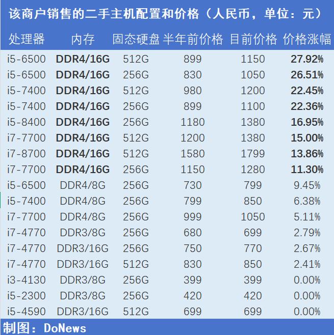 下图是DoNews整理的其店铺现在和半年前不同配置的价格对比,不难看出,涨价的幅度与内存强相关,涨幅靠前的配置组合都包括DDR4内存,其中包含16G内存的配置组合涨价都在10%以上,与商家所说的“大概翻了三四倍”相符合,而DDR3内存对价格几乎不存在影响。