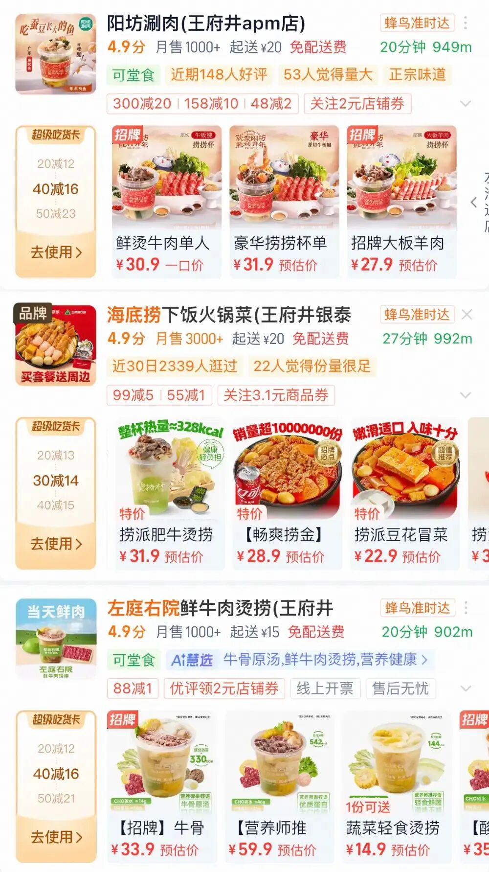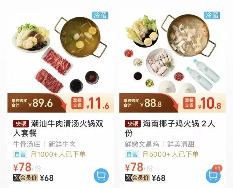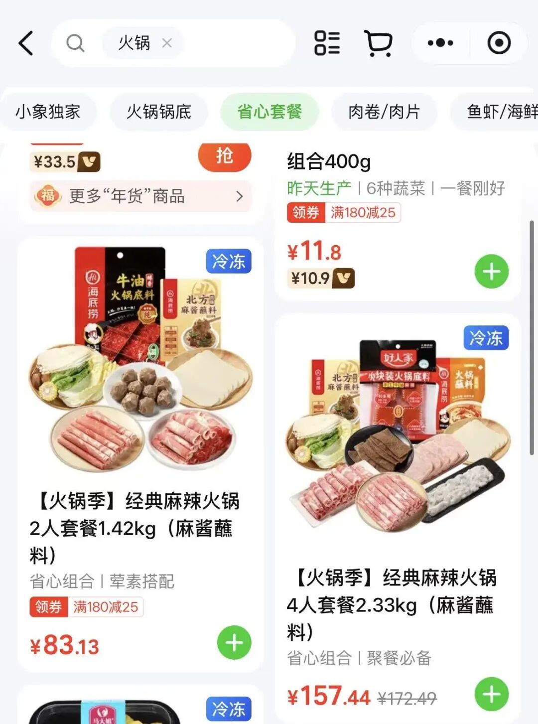从自热火锅流出的需求,转入了不同的产品形态:人们可以在外卖点一份火锅门店出品的冒菜、烫捞杯或麻辣烫,也可以直接在超市下单快手菜配送到家,甚至能够选择从汤底到蘸料都打包配好的整份火锅,人均也不过20-40元。