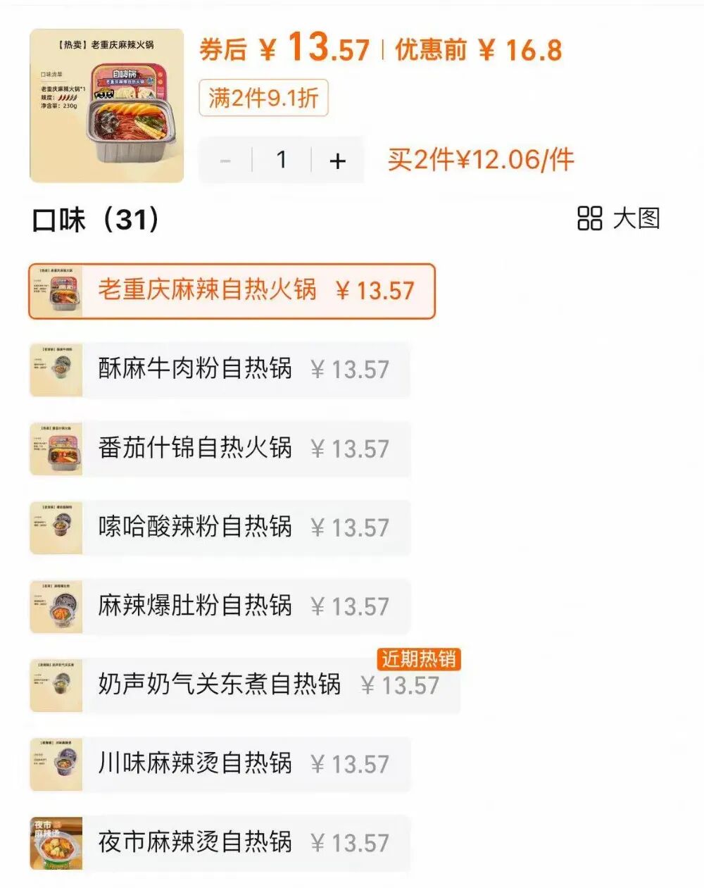 相对而言,自嗨锅的风味显得单一,大多是咸辣为主的重口味,食材组合也高度雷同。仅“麻辣牛肉”一种口味,就出现了麻辣牛肉、麻辣肥牛、麻辣牛肉(微麻微辣)、麻辣肥牛(微麻微辣)四种品类。这导致自嗨锅的SKU虽广,却无法分别覆盖不同口味的客群,反而成为品牌库存管理的拖累。