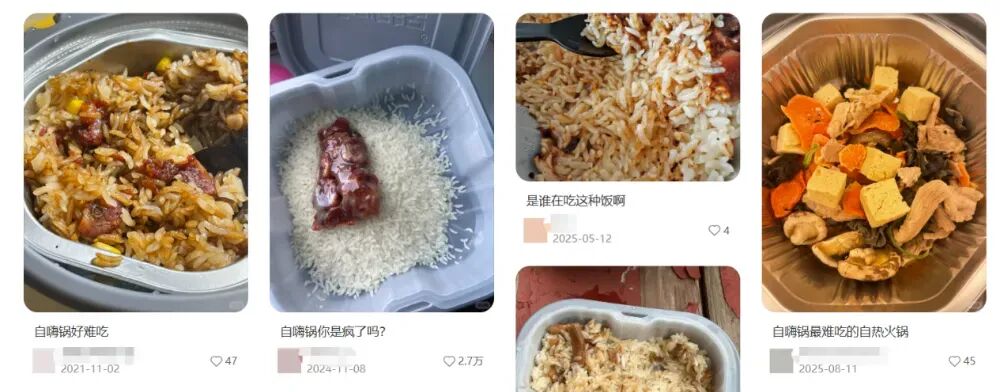 社交媒体上充满了对自嗨锅的吐槽:火锅油腻但食材不入味、自热米饭的米口感像塑料、脱水蔬菜又干又瘪、包装又大又沉但能吃的分量极少……