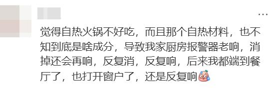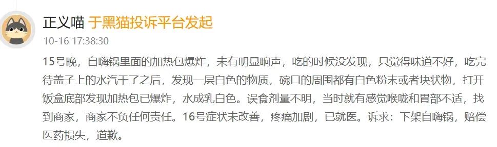 此外,还有不少人反映加热过程中很容易引发烟雾报警。加热包自身也存在安全隐患,黑猫投诉平台上有大量加热包自爆,内容物随水蒸气混入食品的客诉案例。人们为年轻、潮流、便捷的都市生活幻想而买单,问题重重的生石灰加热包却告诉他们,他们买到的仍然是数年来毫无改进的原始加热方案。这是自嗨锅渴望笼络的客群们无法接受的。