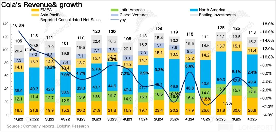 4Q25 可口可乐实现表观营收 118.2 亿美元,同比增长 2.4%,不及预期。其中公司内生营收(Organic revenue)增长 5%。