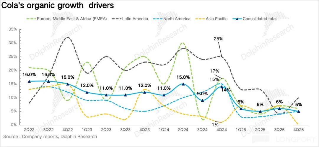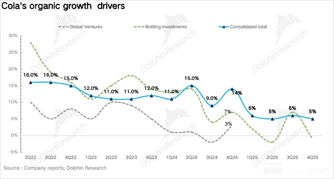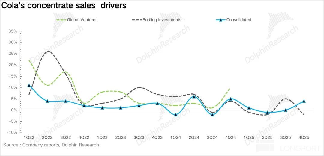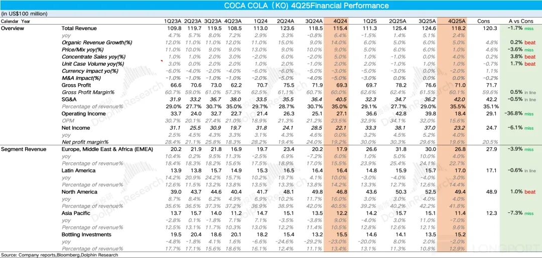 1、价格增长不及预期。4Q25 可口可乐实现表观营收 118.2 亿美元,同比增长 2.4%,不及预期。其中公司内生营收(Organic revenue)增长 5%,量价拆分看,浓缩液销量同比增长 4%,但如果和单位箱销量(体现终端消费需求)1% 的增速结合一起去看,海豚君推测主要是瓶装商提前备货所致。