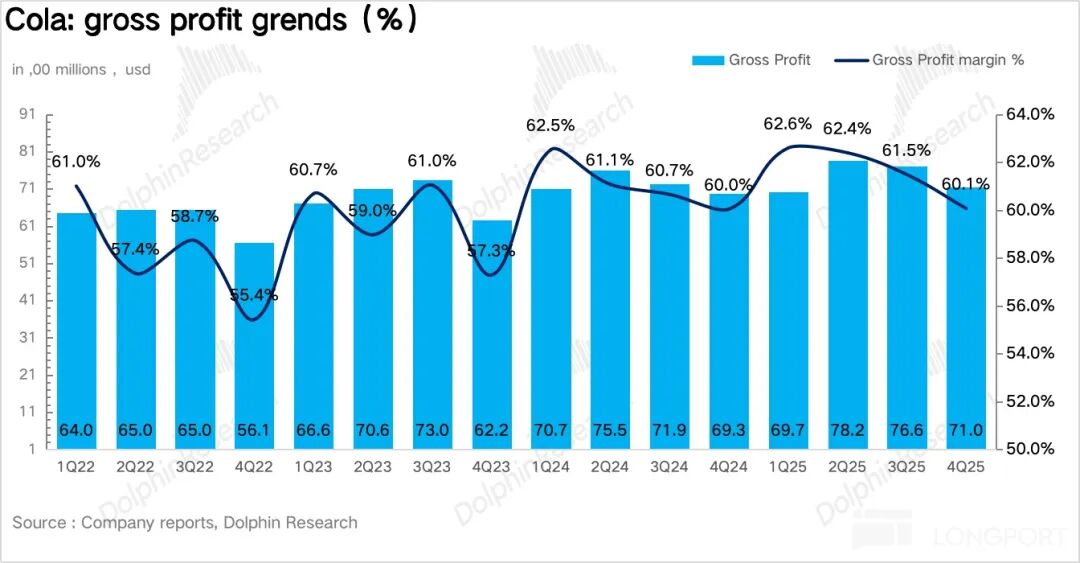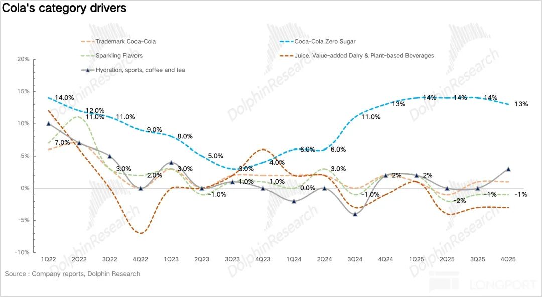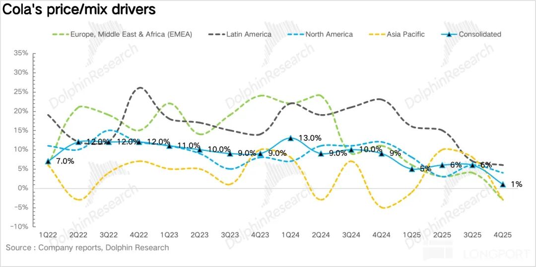 量:4Q25 浓缩液销量同比增长 4%。和三季度类似,和健康相关的品类包括零糖、Fairlife、能量饮料仍然是可口可乐销量端的核心增长引擎。