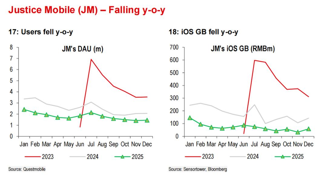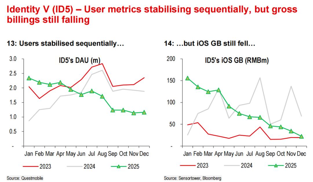 而实际情况是老游戏的表现没有完全撑住:端游则相对好一些,主要体现在《燕云》、《梦幻西游》畅玩服的增量贡献。但手游上,《第五人格》继续受到竞品影响,《逆水寒》、《永劫无间》流水下滑,而《燕云》手游虽然周年庆表现不错,但毕竟是12月底才开启,《蛋仔》的反弹也同样在12月更加明显,因此来不及弥补缺口。