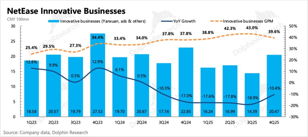 云音乐则继续回归增长(基数变低),环比稳定,主要聚焦提效控费。其他创新业务收入下滑10%,因为电商竞争,严选仍然在收缩趋势中。