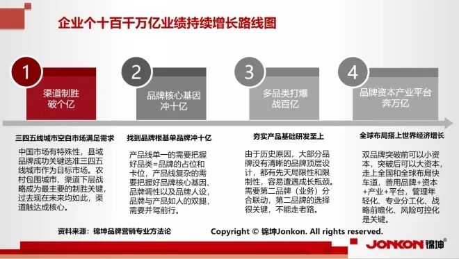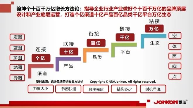 回到主题,我们说企业的发展是有逻辑的,业绩的增长是有方法的,关键是我们怎么结合个十百千万亿的发展阶段,制定相应的路线图、结构图、行动图,通过“四one”产品+“四品”品牌+“四信”传播构成的品牌顶层设计的基础上有效高效快效地推进“四客”营销+“五关”管理+“六力”运营品牌的营销底层运营,从而让产品畅销长销高价销,实现企业业绩的持续结构增长,通过个亿-点-导图、十亿-线-地图、百亿-面-拼图、千亿-体-蓝图和万亿-空-宏图相继从个亿奔向十亿、冲向百亿、跃向千亿和迈向万亿!