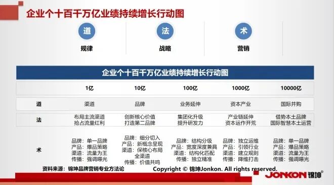 同样每个阶段我们都要做产品,10亿阶段的产品策略是爆品策略,1000亿阶段的产品策略也是爆品策略。50亿需要新产品概念,100亿阶段产品宽度和深度要解决。当我们想明白这不同阶段的特征,我们就可以想到针对不同的企业怎么去实施持续增长。既要有路线图,也要结构图,更要有行动图。路线再好、结构再强,行动不了就是胡扯。先把产品卖出去,把渠道撕开是王道。