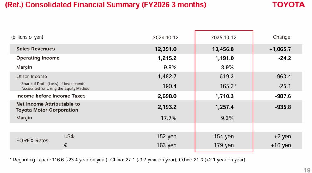 丰田还单独列出了2026财年前三季度(2025年4-12月)中国业务业绩,其中合并子公司营业利润为1386亿日元(约合人民币56.64亿元),较2025财年同期的1254亿日元(约合人民币62.61亿元)增加了132亿日元(约合人民币5.96亿元),同比增长约10.5%。