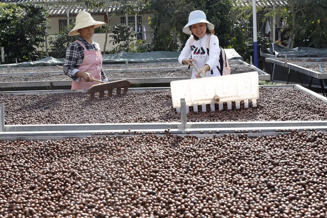 △游客在普洱的一处咖啡庄园内体验整理日晒咖啡豆。(图/李嘉娴/中新社云南分社/视觉中国)