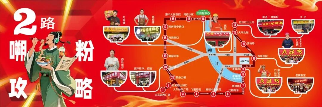 这两条车本身也挺有“嗍粉氛围”。车厢和站牌做了螺蛳粉相关的装饰,路线图不只标站名,还会把沿线的螺蛳粉店名直接标出来,贴上店铺主理人的照片。乘坐公交觅食,基本不用担心踩雷。