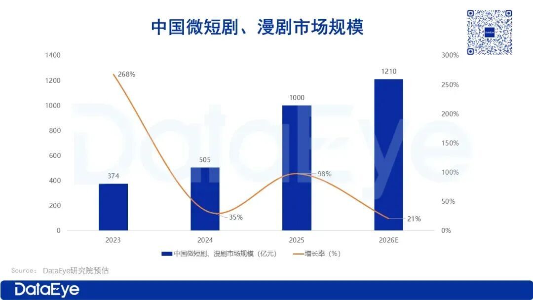 DataEye研究院数据显示,2025年中国短剧、漫剧全年产值突破1000亿元,为同期电影票房518.32亿元的近两倍。