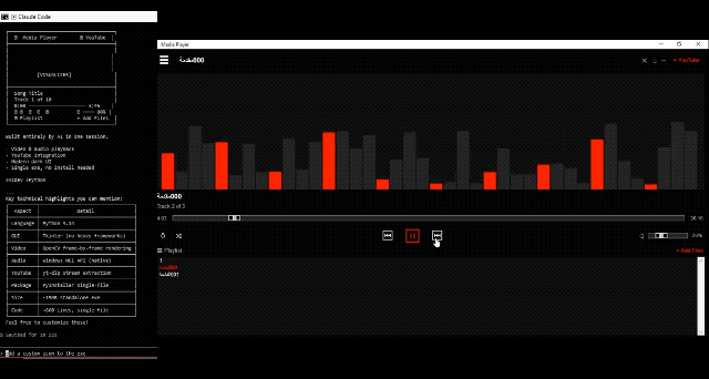 而网友 @zakarinoo7 生成了一个全功能的媒体播放器——支持 MP4/MP3 解码、播放列表管理,甚至连深色模式的 UI 都写好了,编译完只有 15MB。