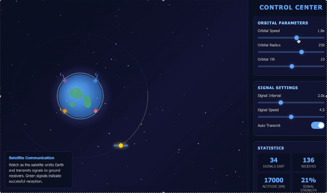创建一个交互式的 HTML、CSS 和 JavaScript 卫星系统模拟程序,该程序应模拟卫星向地面接收器发送信号的过程。模拟程序应显示一颗卫星绕地球运行,并周期性地发送信号,这些信号会被多个地面接收器接收。