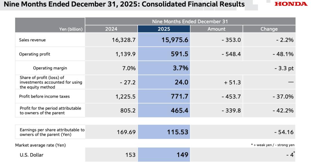 如果将视线放长至本田的前三个财季,截至2025年12月31日的9个月内,公司营业收入15.98万亿日元,同比减少2.2%,经营利润更是暴跌至5915亿日元,相比同期1.14万日元的营业利润,减少了48%。