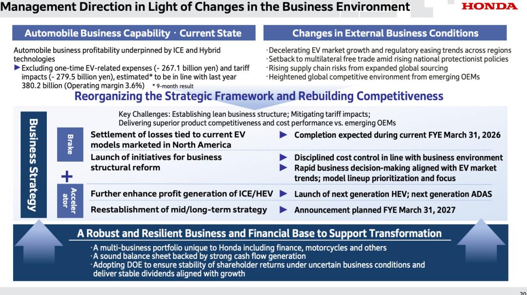 “我们目前的挑战是建立一个精简的运营结构,能够灵活应对商业环境的变化”,其还表示,本田将“显著调整未来电动汽车战略”,并将在近期公布新的规划。
