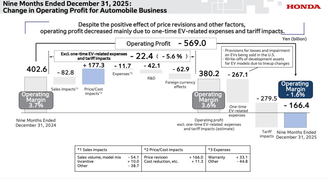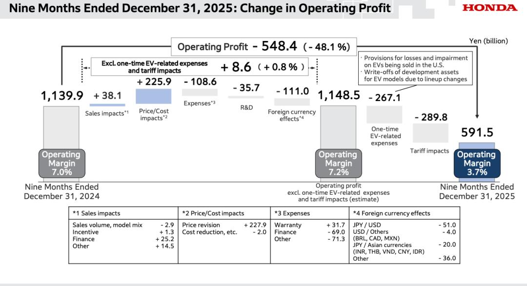 对于前三个财季利润大跌的原因,本田也在报告中直接指出,是来自美国关税的影响以及与电动车相关的一次性费用导致利润下降。
