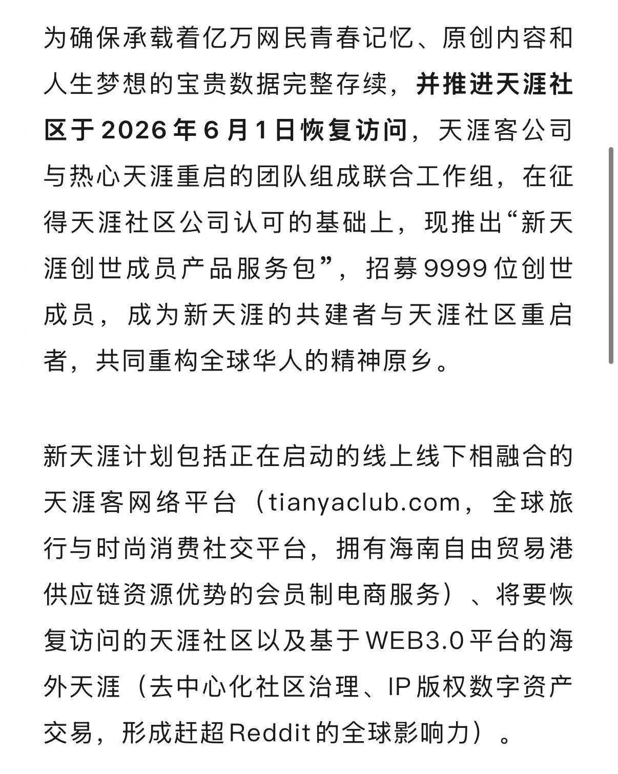 近期,天涯神贴公众号发布官方消息,确认天涯论坛将于2026年6月1日恢复访问,同时启动「新天涯计划」,并宣布推出「新天涯创世成员产品服务包」,计划招募9999位创始成员。据了解,天涯论坛在2023年因服务器欠费暂停网站浏览,期间曾多次发布「复活天涯」的众筹活动,但直至2026年才发布回归公告。