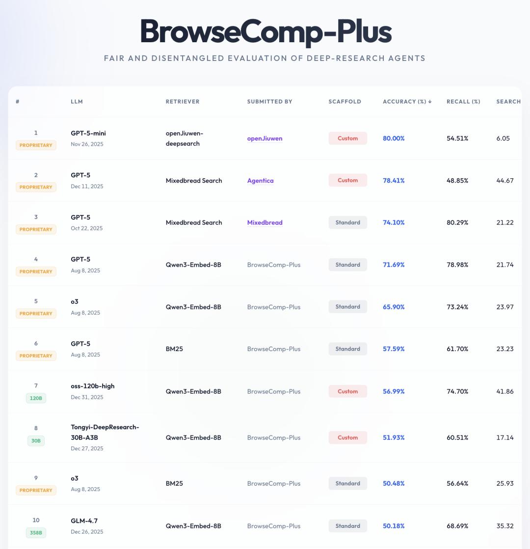 - BrowseComp-Plus 榜单:攻坚深度搜索核心考验