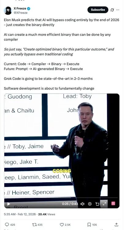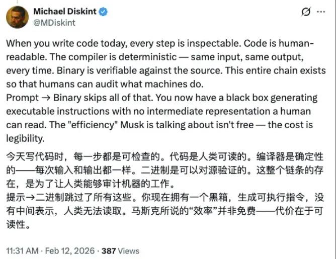 马斯克的判断更为激进。在他看来,“写代码”本身正在显露出一种过渡形态的特征,最终只需要一句“为这个特定目标生成一个经过优化的二进制程序”,就可以直接绕过传统意义上的编程过程。