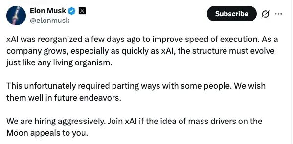 在这条帖子中,他还强调,公司正在“积极招聘”,并用一句极具个人风格的招募语收尾——如果你对“月球上的大规模驾驶器(mass drivers)”这个想法感兴趣,欢迎加入 xAI。