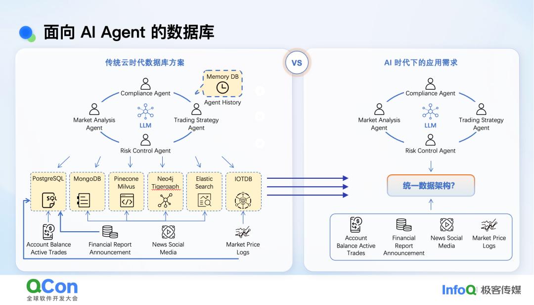 这里有 4 个 Agent,有一个 Agent 主要负责市场分析,一个 Agent 要关注风控,等等。从数据的视角来看,在这个 App 里我们可能需要很多种不同的数据库。我可能需要有用户的信息,用户的信息一般是存在表格里的。我可能会有财报,往往是一种半结构化的数据,里面可能有一些结构化的东西可以抽出来。如果外部的知识库很大,包括很多日志,它可能也是要放入 Mongo 的。