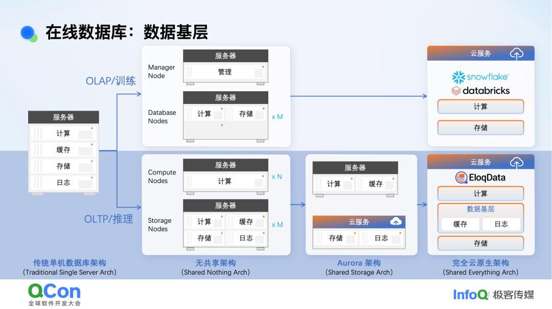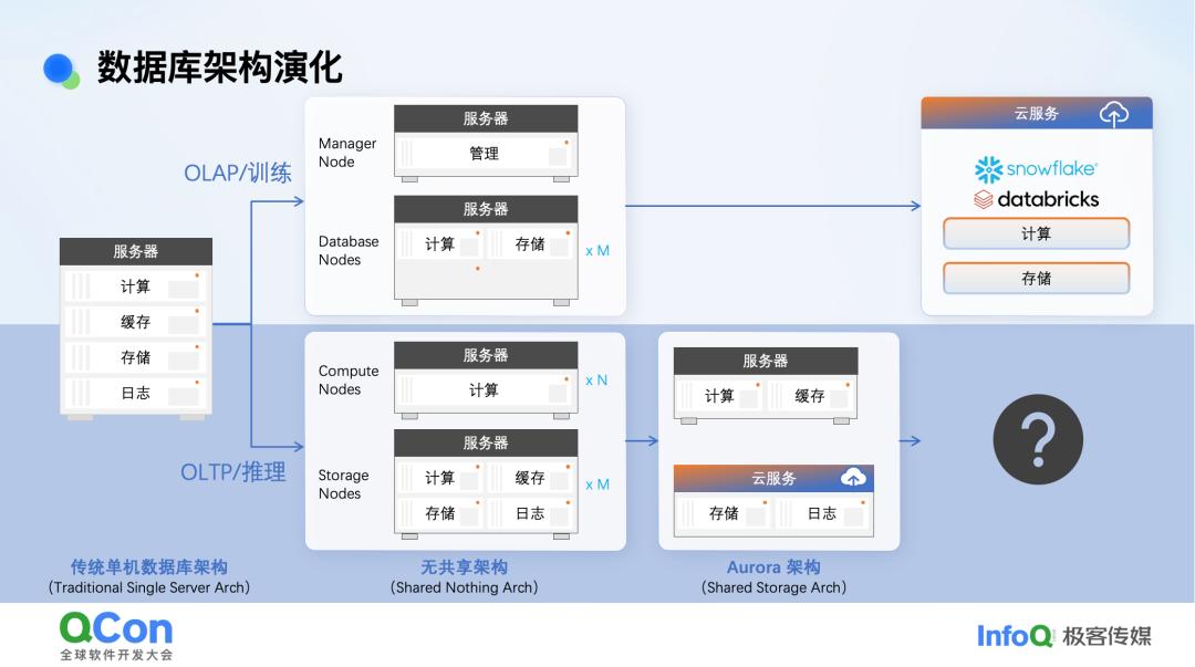 数据库在很早以前实际上就一台机器,后来数据库演化就分叉了,分成了 OLAP 和 OLTP。到了云时代,之前 OLAP 数据库的无共享架构就不是特别理想,于是就有了新的做法叫存算分离。OLTP 一开始也有无共享架构,但后来它的演化就没那么简单。因为 TP 和 AP 之间有一个很大的不同,AP 里不太在意内存缓存。因为它要不断扫描大量数据,内存肯定放不下,最后总是要扫描磁盘的。可在线的 TP 就不一样了,因为需要毫秒级的延迟,所以内存缓存非常重要,是保证延时最重要的手段。而无共享架构下计算和缓存不在一块,每次访问都要走网络,那么在 Agent 时代这个延迟就很难保证。所以业界提出了 Aurora 的架构,把缓存提上去,计算和缓存在一块,然后下面有个存储,我们叫共享存储架构,这样它的延时可以保证。