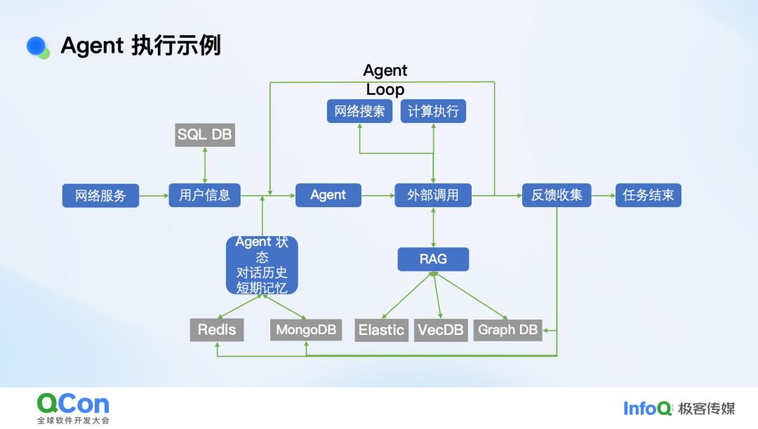 上图展示了今天常见的一个 Agent 的工作流。它一般是一个网络服务,用户会登录进来,登录之后你会有用户的信息,这时你就要访问一些关系型数据库了。