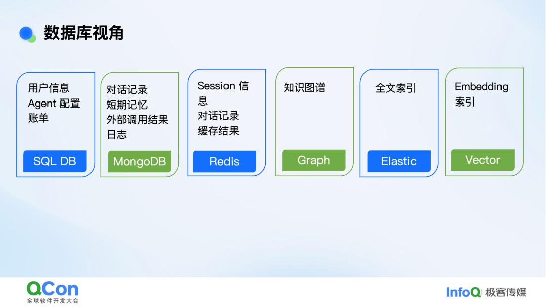 所以在搭建 Agent 应用的第一天,可能就会涉及到很多种数据库了。而外部来的数据规模你是不可管控的,如果规模很大怎么办?这个时候你就得用一个有扩展性的选择。同时从性能要求来说,因为有些业务是和用户要交互的,所以延时要求天生比较严苛,所以我一定会有一个纯内存的东西。