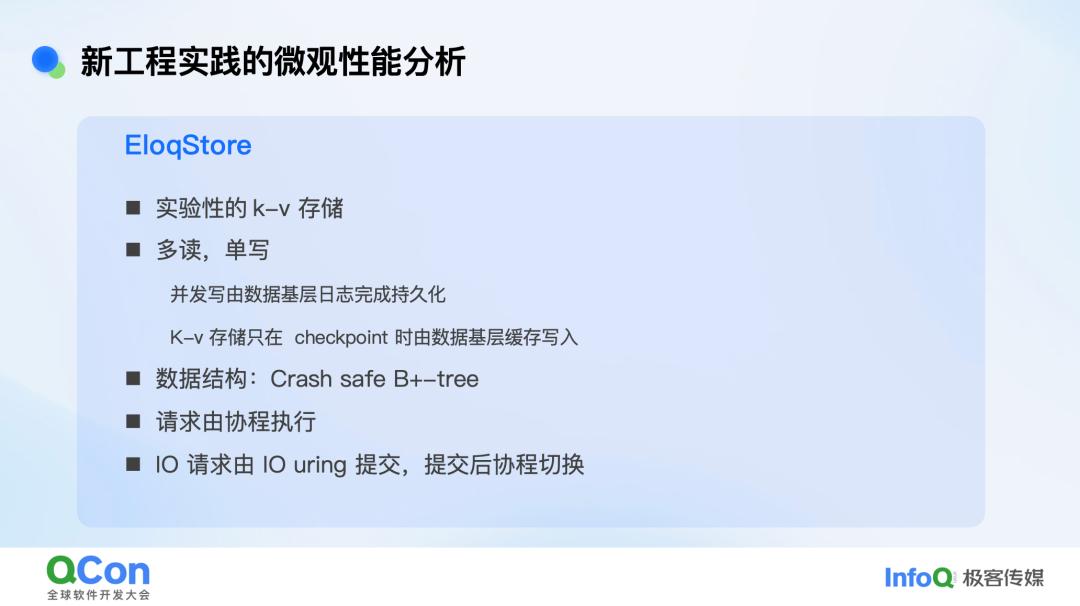我们公司还做了一个试验性的存储,它是一个 k-v 存储,是多读单写的。我们每个查询做一个协程,提交后切换协程。