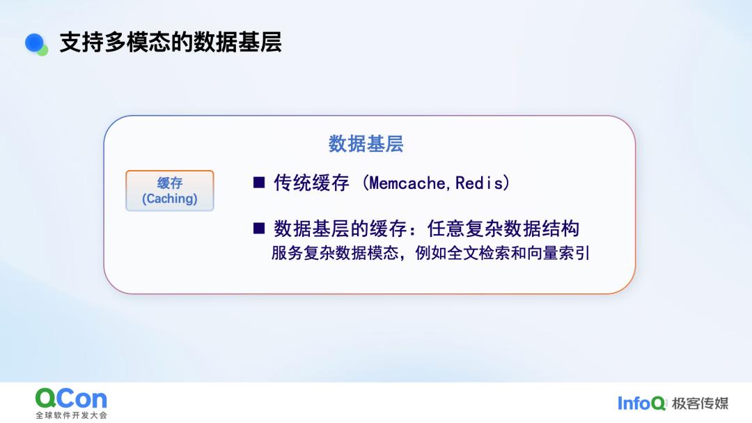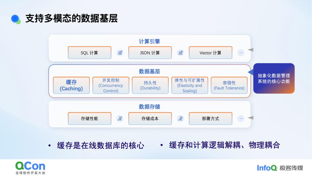 我们的思路是,在计算和存储之间会有一个数据的基层,在基层里我最强调的就是缓存,缓存是保证在线数据库延时里最重要的一个事。而且在线数据的所有模态,不管是做向量搜索、全文搜索还是做 graph,最重要的都是缓存,不在缓存里的东西延时是很难有保证的。