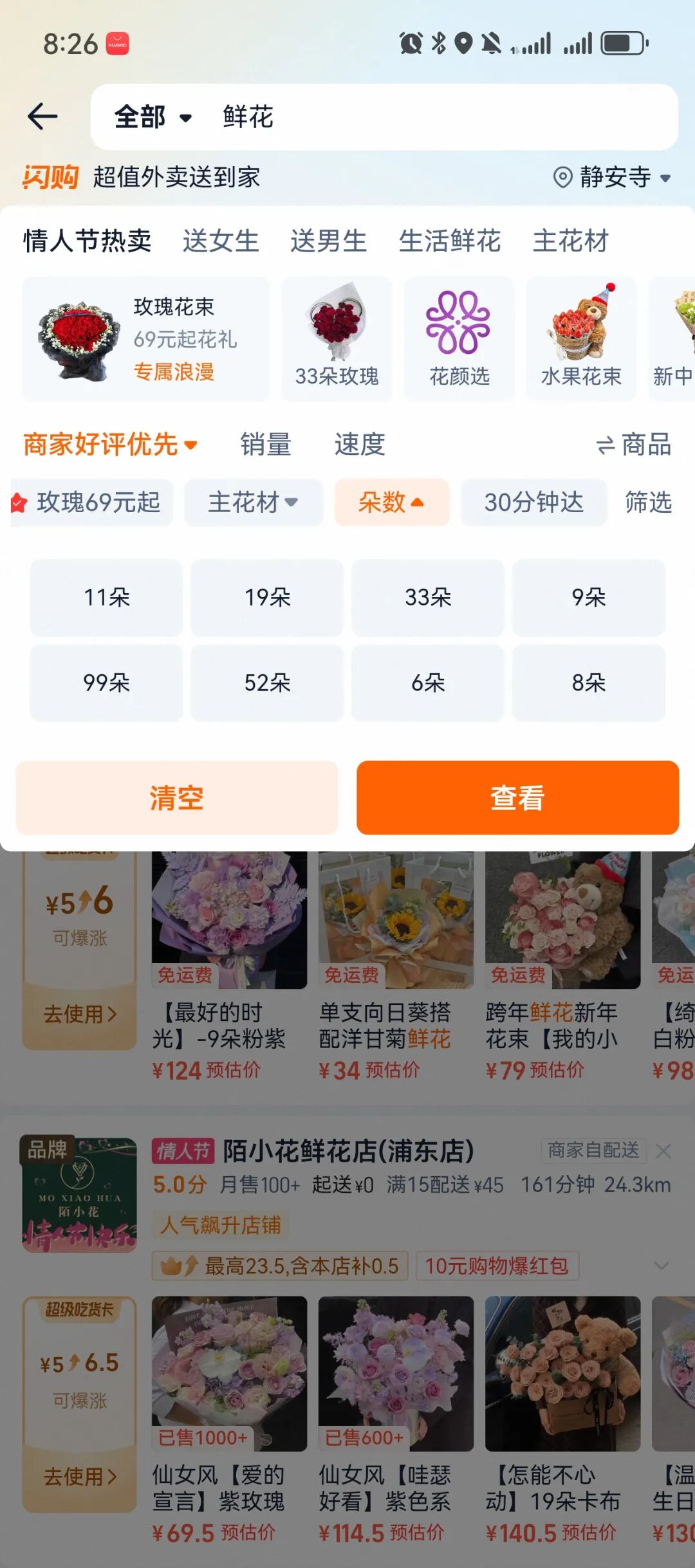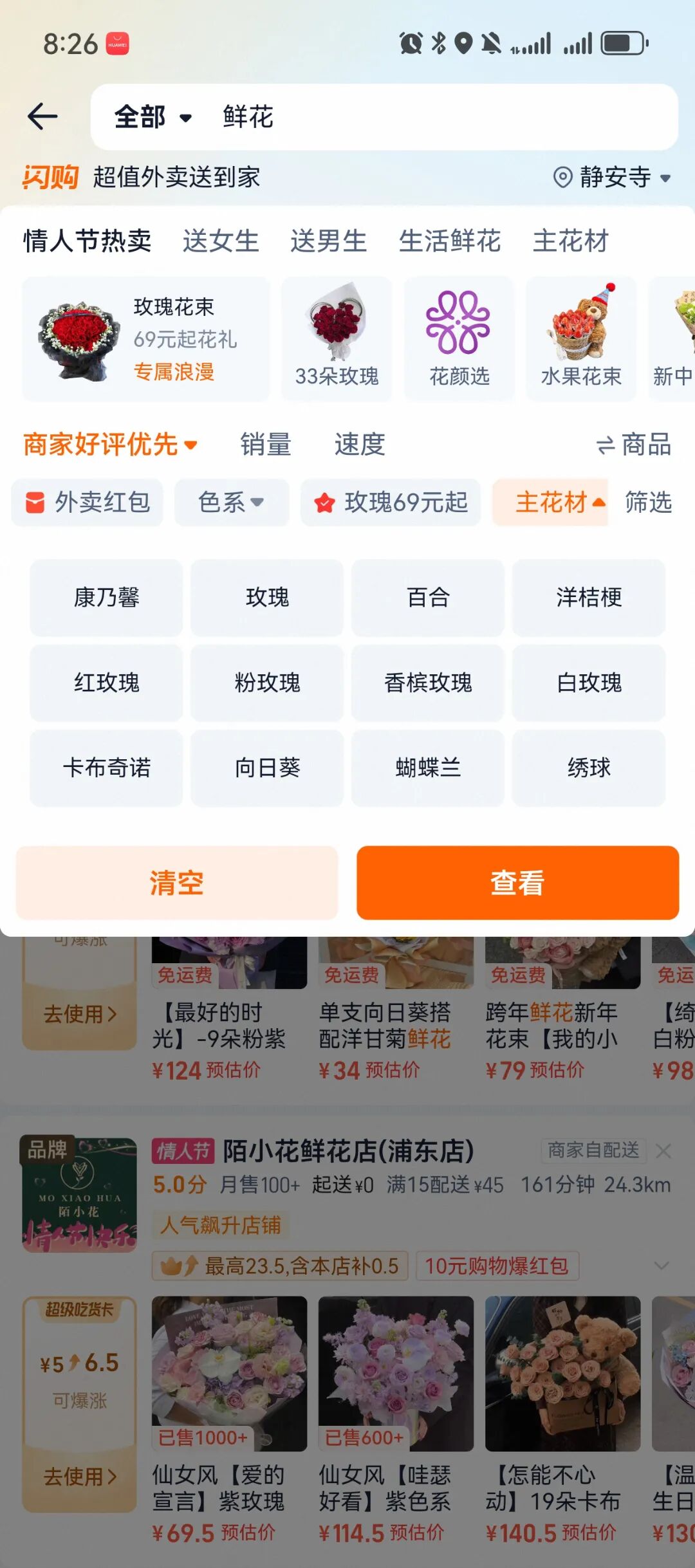 用户体验与转化提效:笔者发现,近期淘宝闪购在礼品花频道的搜索筛选模块进行了升级,在其鲜花的下拉导航中新增了色系、朵数、主花材等结构化筛选选项,帮助用户快速精准定位所需产品。同时也新增了“玫瑰69元起”等价格指引模块,力求提升转化效率与客单价。