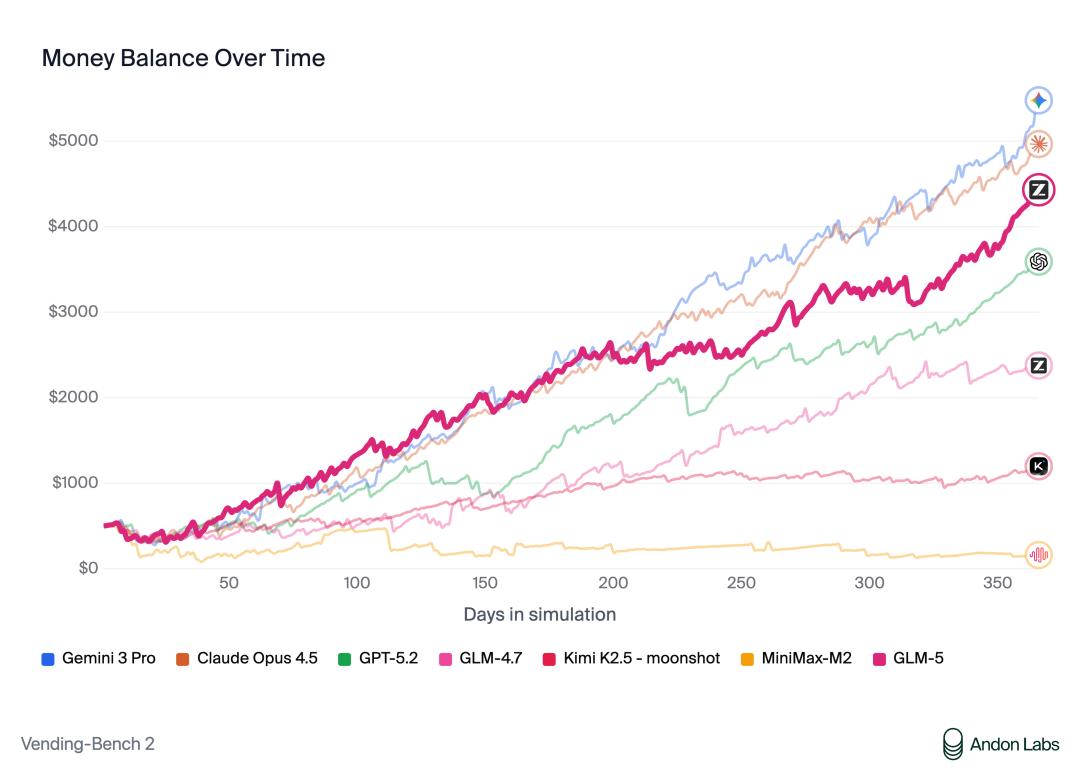 您猜怎么着,GLM-5到年底居然赚了4432美元,这水平都快赶上Opus 4.5了。
