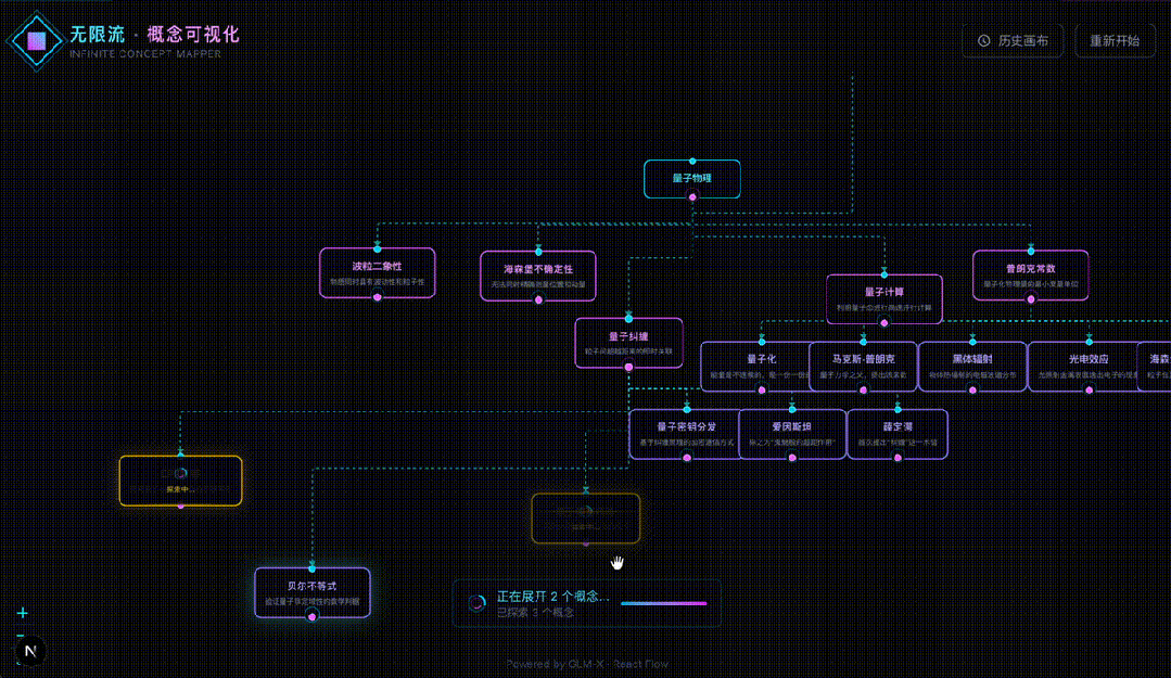 - 核心概念:这是一个“永远点不完”的思维导图。用户输入任何一个关键词(比如“量子物理”或“红楼梦”),系统生成中心节点。点击任意节点,AI实时展开其子节点。