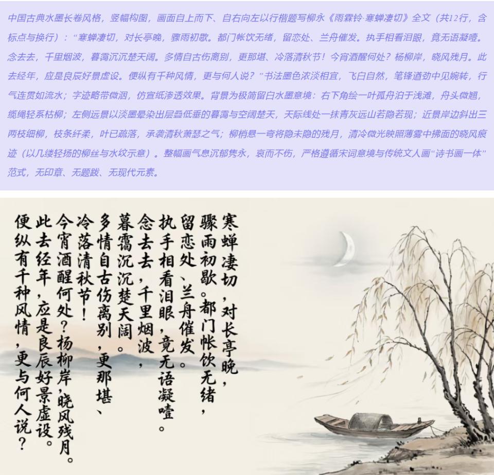 具体来说,它能解析比较长的中文指令(支持最多1000个字符),对中文文字的生成也相对准确。比如生成带有古诗词的图片,像《雨霖铃·寒蝉凄切》这类文本,在字形、排版上能保持较好的还原度。对于需要在图片中准确呈现中文文字的场景,比如海报、广告图等,这类能力会比较实用。