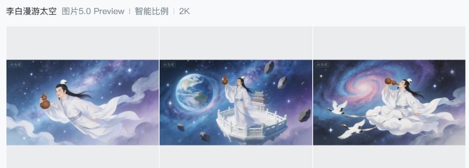 比如我输入一个“李白漫游太空”的创作指令,大模型能理解这是一个超现实风格的创意需求,而不是字面意思,生成的画面会在保持古典诗人形象的同时,融入太空场景。