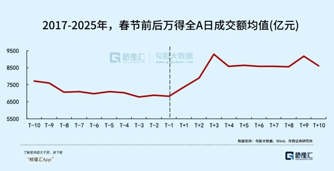 根据机构,复盘2017-2025年,万得全A春节后10个交易日平均涨幅3.3%,春节前10个交易日平均跌幅-1.3%,多数年份节后表现优于节前。