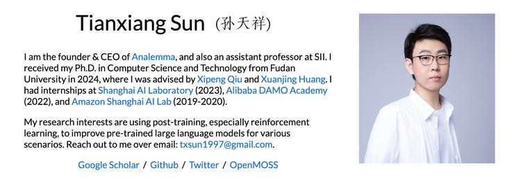MOSS走红时,孙天祥还在读博。据了解,当时国内几位知名的大模型创业者都曾邀请他加入,但彼时博士还没毕业。2024年毕业后,VC也接踵而至。他最终选择了自己创业:2025年3月创办Analemma(日行迹智能),同期加入上海创智学院担任助理教授,走了一条学术和创业并行的路。