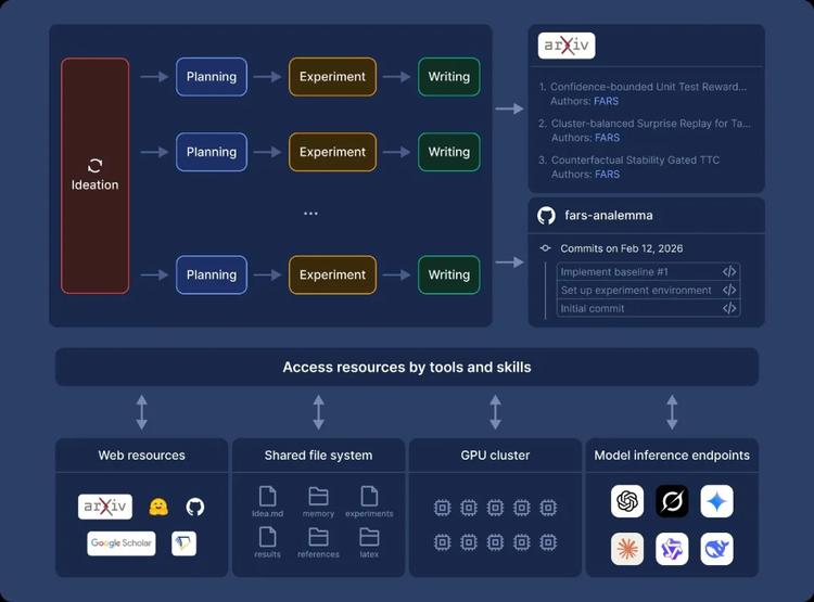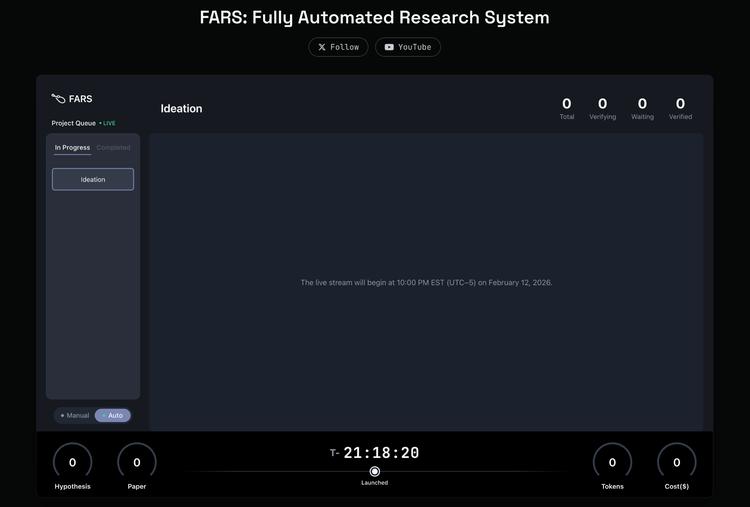 屏幕里将没有主播,只有一个名为FARS的AI系统在工作。它将从零开始,自主完成科研全流程:调研文献、提出假设、设计实验、编写和执行代码、分析数据、撰写论文,目标是连续产出100篇完整的研究论文。全程自动,没有人类介入。