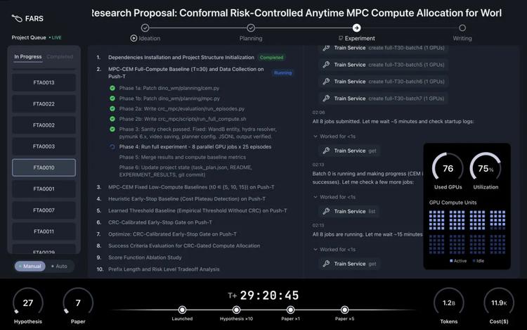 FARS目前聚焦的研究领域是AI本身。孙天祥在Google Scholar上标注的研究关键词中有一个"AI4AI",即用AI来研究AI。选择这个领域有务实考量:AI领域的实验可以完全在计算机上完成,不需要物理实验室,天然适合自动化。当然,局限也很明显:FARS暂时无法进行极度消耗算力的实验(如大规模预训练),也无法完成需要人类直接参与的实验(如人工标注或专家评估)。
