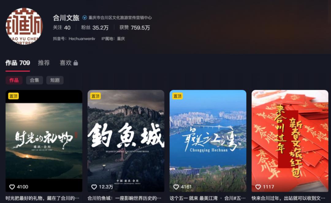 面对泼天的流量,合川文旅以“闪电战”应对,完美接盘。1月11日,合川文旅抖音账号粉丝为3.29万,截至锌刻度发稿前,其粉丝量已涨至35.2万。自刨猪宴爆火后,该账号发出的多条宣传视频均获得较高点赞量,后续策划的“最美江湾,不夜合川”无人机表演、年货集市活动也纷纷受到关注。