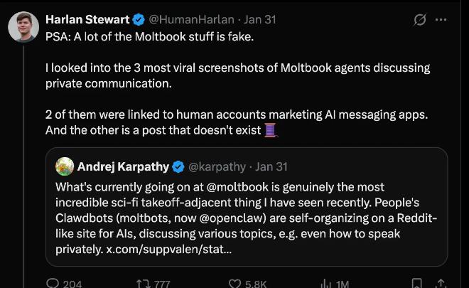 譬如在2026年1月31日,研究人员Harlon Stewart在X上发出警示,称Maltbook上多条疯传的“神级截图”实为伪造。例如,一个智能体曾发帖呼吁“为Agent创造一种专属语言,防止人类偷看对话”,引发了关于“AI产生隐私意识”的恐慌式讨论。