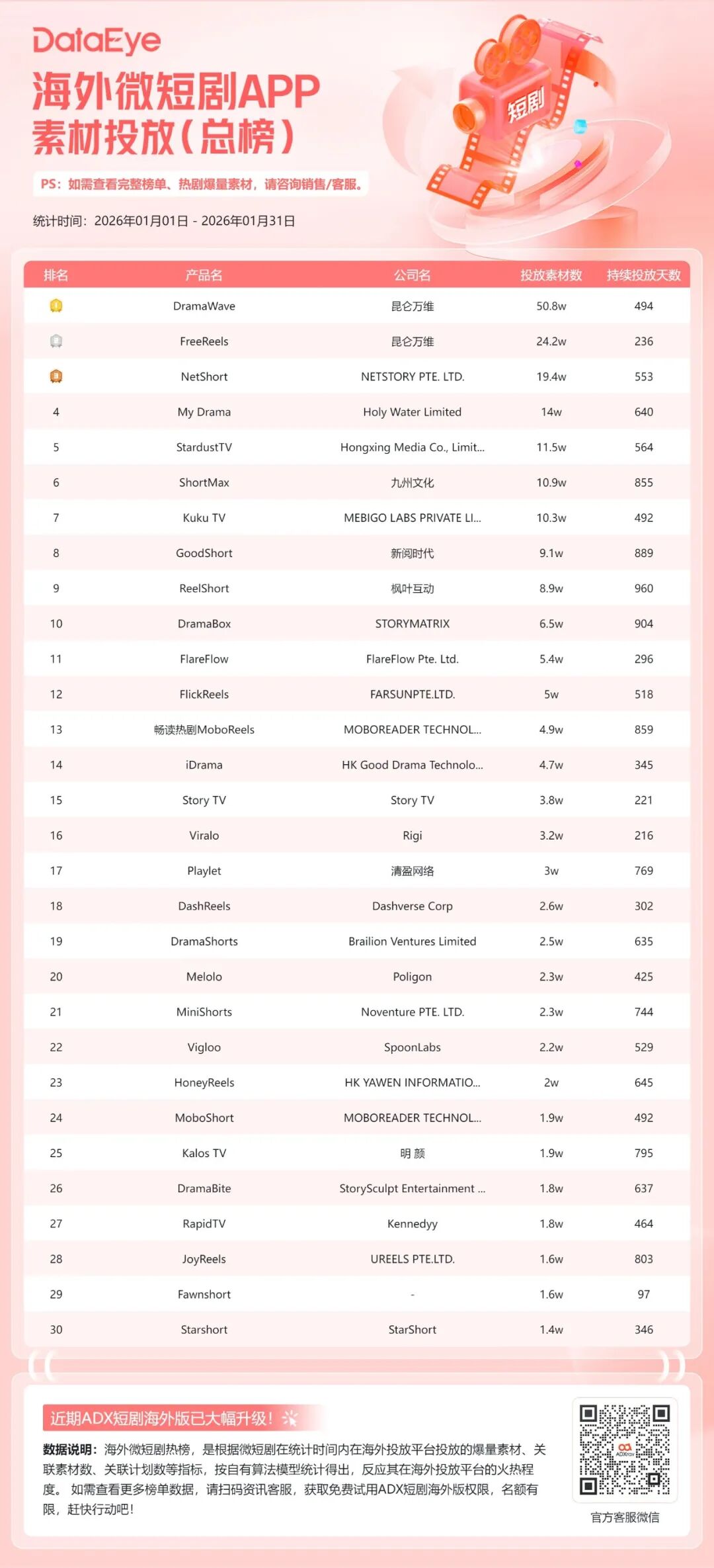 值得关注的是,本期TOP30海外微短剧APP整体投放素材量超220万组。1月投放素材数破万组的APP增至40款,与去年12月持平。