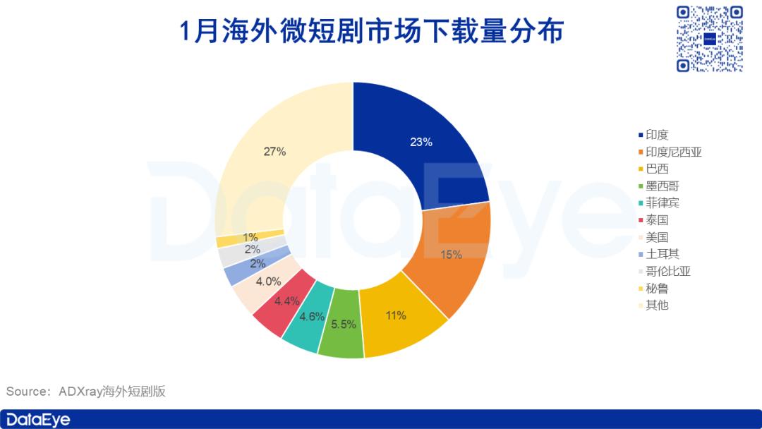 下载量方面,市场同样呈现高度集中的特征,人口红利成为核心驱动因素。1月海外微短剧双端预估下载量中,印度以突破5400万的成绩断层领先;印尼位居第二,下载量超3500万次;巴西位列第三,下载量超2600万次。此外,墨西哥、菲律宾、泰国等国家的双端预估下载量均突破1000万次。