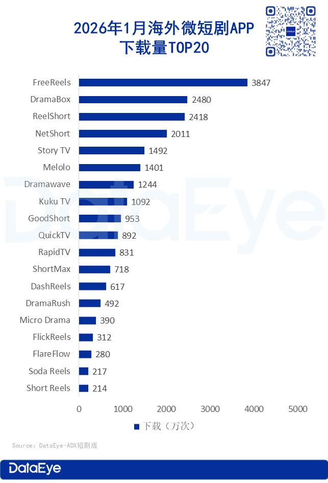 2026年1月海外微短剧APP下载量TOP20排行榜中,昆仑万维旗下FreeReels再度登顶下载榜(去年11月首次登顶),单月下载量突破3800万次,环比激增98%;DramaBox、ReelShort分别位列第二、第三,二者下载量均超2400万次,环比涨幅均超10%。