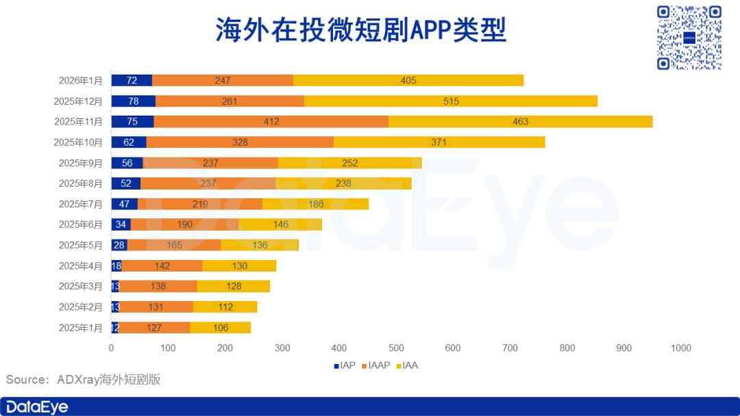 当前海外微短剧市场以IAA、IAAP两种变现模式为主导。自2025年下半年起,IAA类产品数量迎来激增,已连续六个月位居品类首位,而IAP类产品增长动能放缓。这一趋势表明,免费变现模式与混合变现模式,正逐步成为海外微短剧行业的核心发展方向。