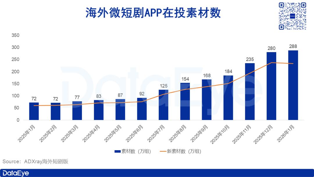 根据DataEye-ADX海外短剧版数据,2026年1月,海外微短剧市场广告素材投放量达287.9万组,环比2025年12月微增2%,再度刷新单月素材投放量纪录。自2025年2月起,海外微短剧市场素材投放量便进入持续增长通道:2025年7月单月投放量突破100万组,11月进一步突破200万组,增长势头延续至今。不过近三个月,市场素材投放量虽仍保持增长,增速却有所放缓。