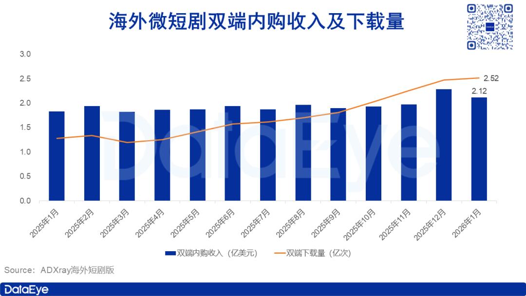 2026 年1月,海外微短剧APP双端总下载量约为2.52亿次,较去年12月环比微增约2%;预估双端内购收入约2.12亿美元,环比下滑约8%,市场增速整体放缓。