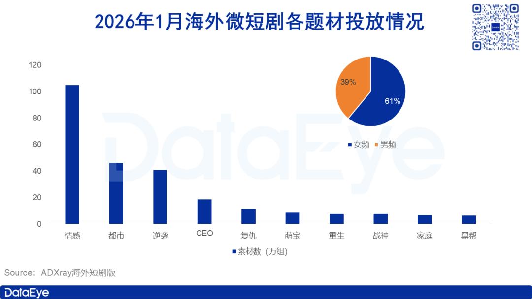 DataEye-ADX海外短剧版数据显示,1月海外微短剧热投题材中,女频素材投放量占比达61%。男频素材占比达39%。相较于上月,男频占比小幅下滑,女频占比略有提升。